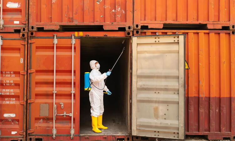 Ngoài ra, sau khi đóng xong container, cửa cont kín, công ty hun trùng sẽ thêm một lần nữa phun thuốc vào trong container qua chỗ đầu cao su ở trên cửa container. Thông thường một container 40ft mất từ 3-4 lọ thuốc, container 20ft mất 2 lọ thuốc phun. Các bạn lưu ý thuốc này rất độc nên không nên đứng gần container lúc container đang được xử lý phun thuốc..